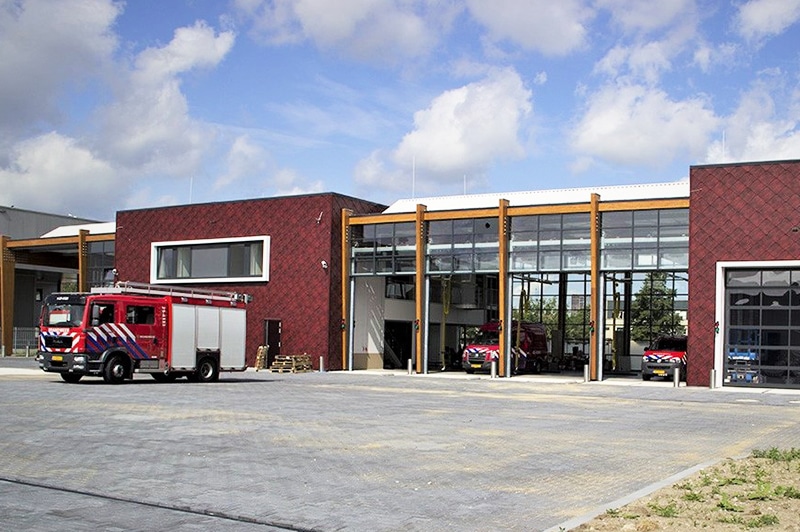 De nieuwe kazerne beschikt over een remise met 4 opstelplaatsen en een wasstraat, werkplekken met vergaderzaal, een sportzaal, woonkamer, keuken en slaapkamers met badkamer. Het gebouw bestaat uit dichte en open delen. De open transparante delen kenmerken zich door de markante houten gelamineerde liggers als constructieve elementen. De dichte delen zijn afgewerkt met een stalen gevel voorzien van een coating in een gemêleerde rode kleur. De ramen worden door witte kaders geaccentueerd.