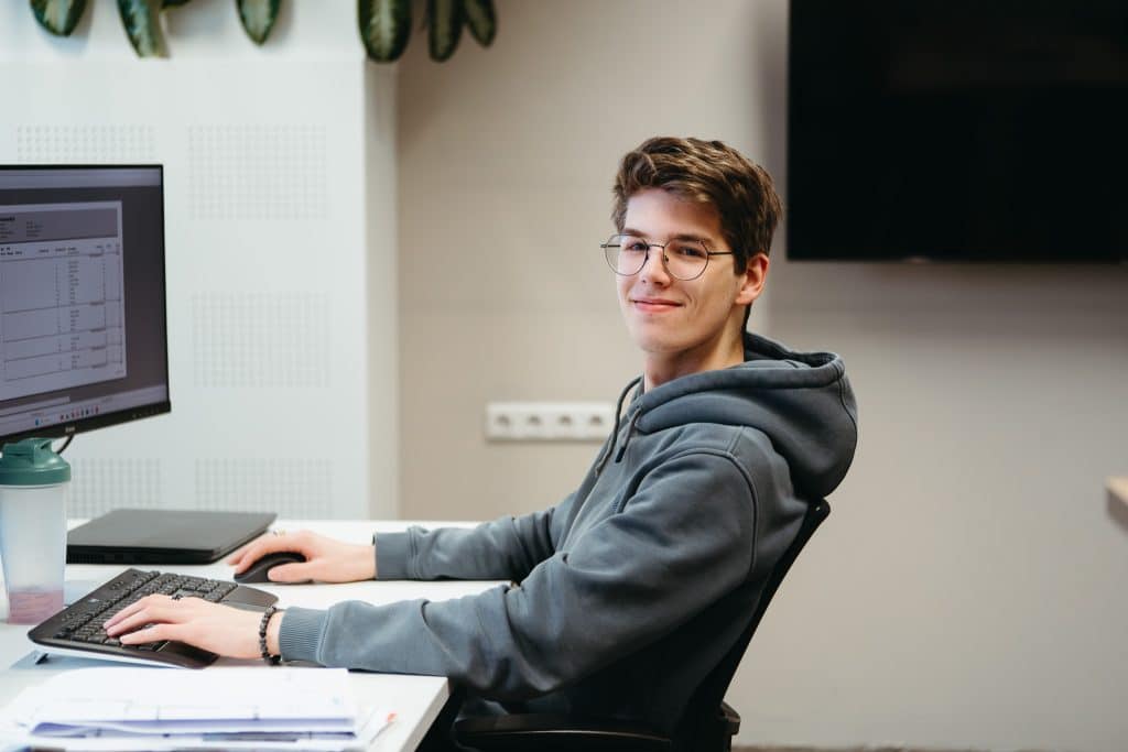 “Vanaf het begin kreeg ik hier veel vrijheid en zelfstandigheid. Ik heb gewerkt aan revisies en in verschillende tekenprogramma’s die ik nog niet kende. Die kennis kan ik goed gebruiken in mijn opleiding. Natuurlijk kon ik altijd bij iemand terecht als ik vragen had. Dan lieten ze zien hoe ze het zelf aan zouden pakken. Aan zulke feedback had ik echt wat!”